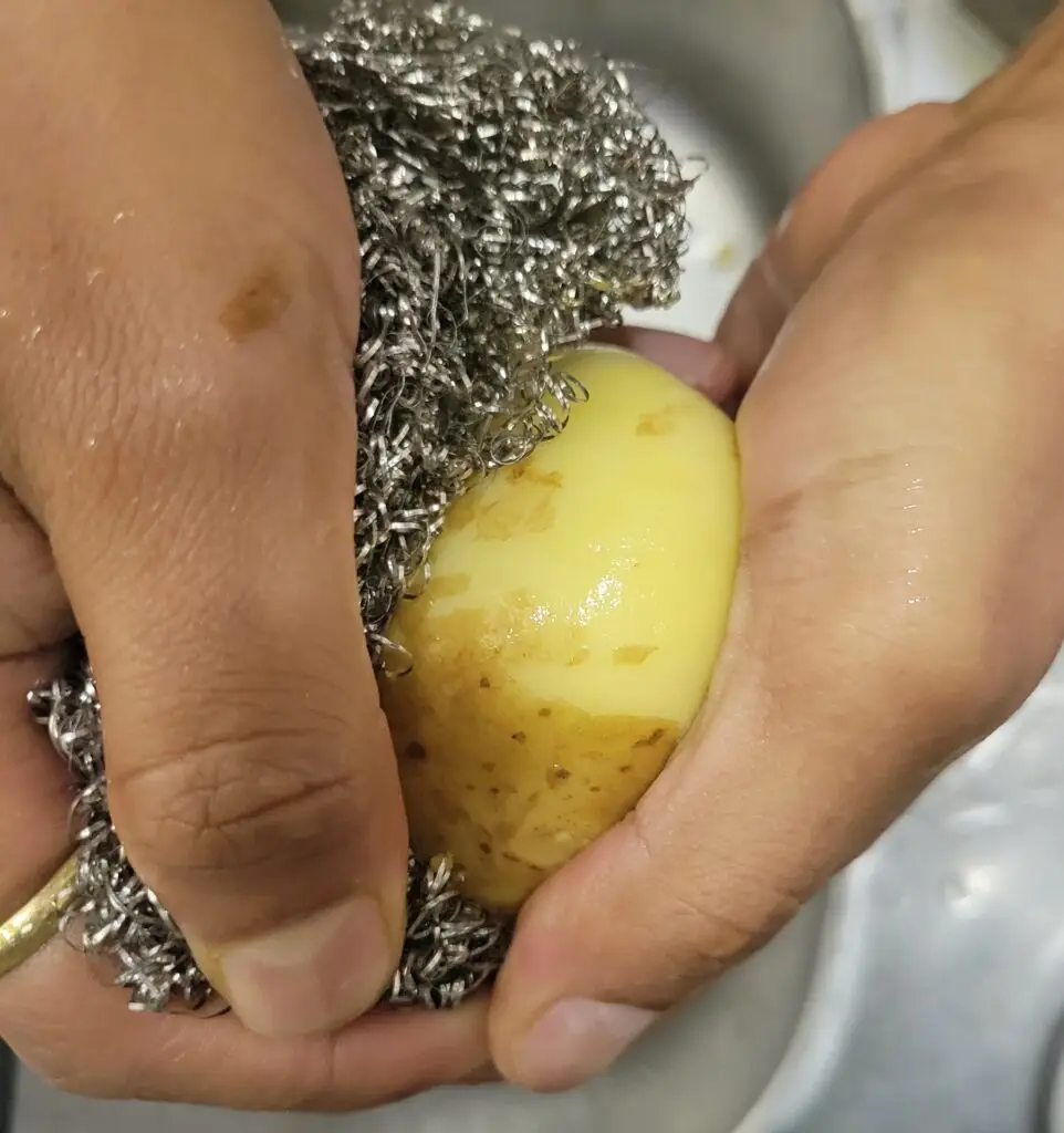 Before peeling the potatoes, boil the water first. Carrying potatoes in one hand and a new iron dish washer in the other hand . Gently wash the potato with the same net with warm water